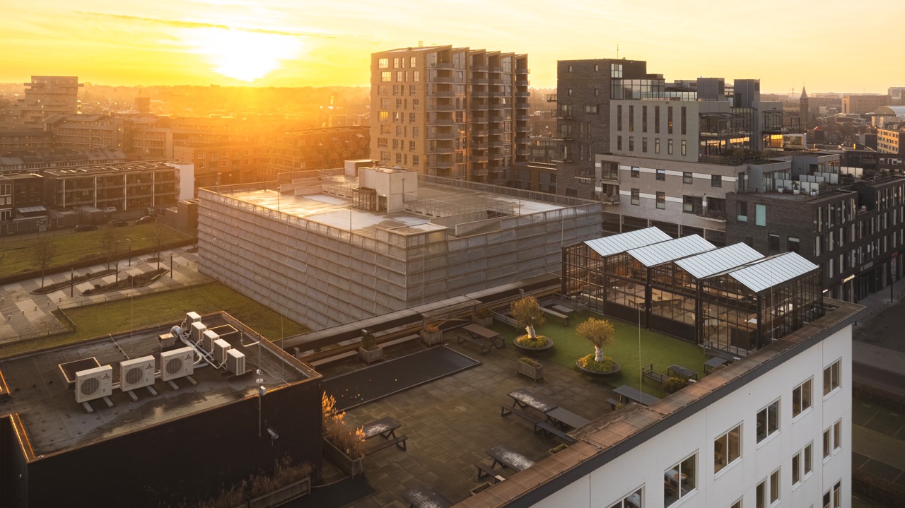 Bovenop het gebouw vind je een ruim dakterras met uitzicht over het Roombeek, een plek die bijna voelt als een verborgen stadstuin. Hier staat ook de jeu-de-boulesbaan, ideaal voor een korte pauze of een informele teambreak.